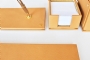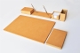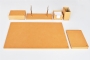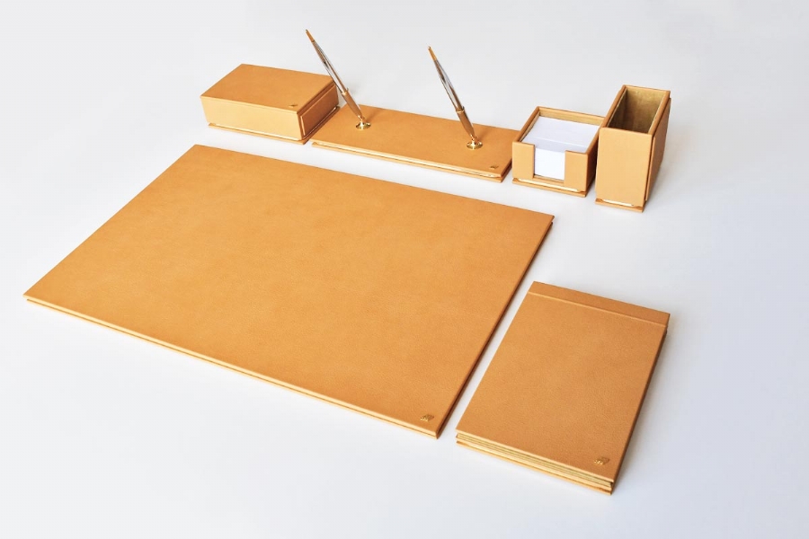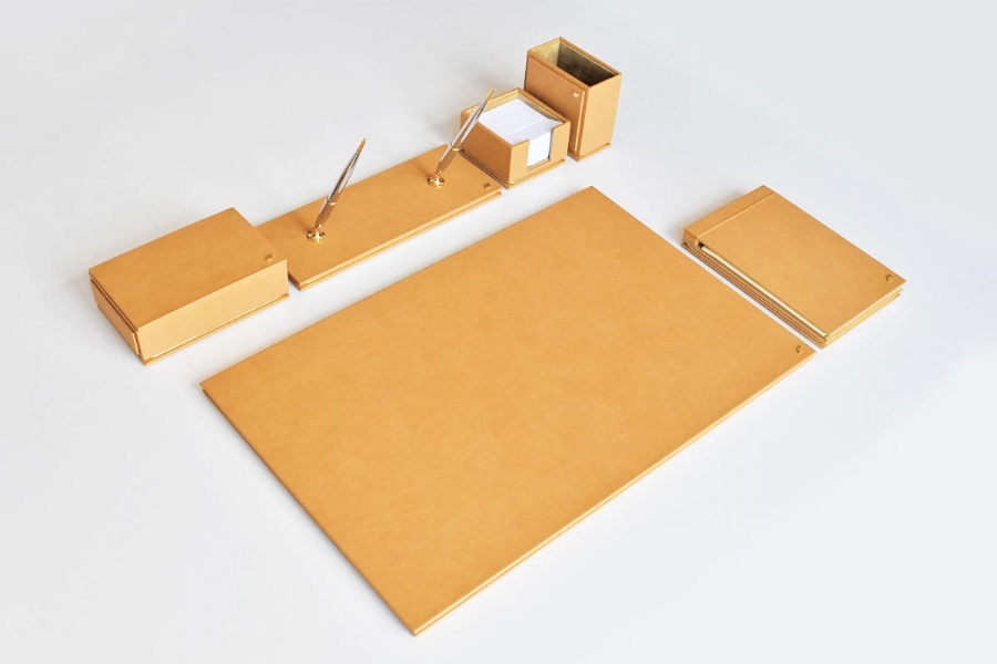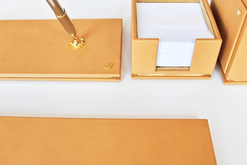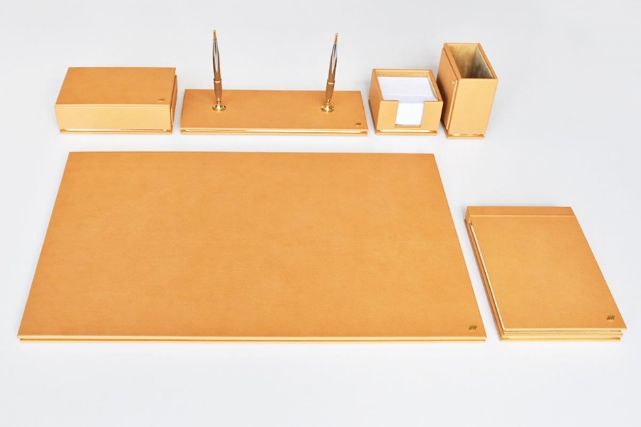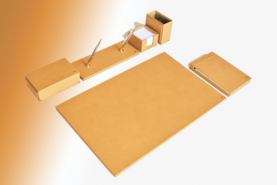 Özenle seçilmiş İtalyan deri ile hazırlanan bu sümen takımı; kusursuz el işçiliği bütünleşmiş ve kullanılan aksesuarlarla zenginleştirilmiştir. Seçkin ofisler için hazırlanmış olan bu lüks masa setinin 40 değişik deri rengi ve özel seçebileceğiniz 20 parçası bulunmaktadır.