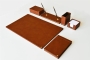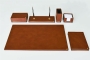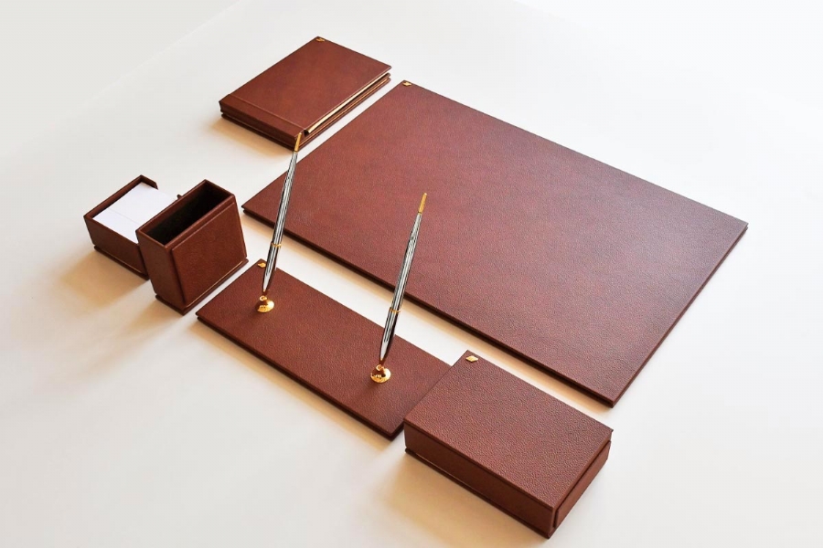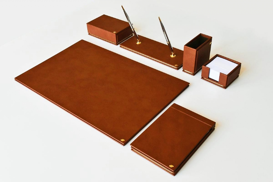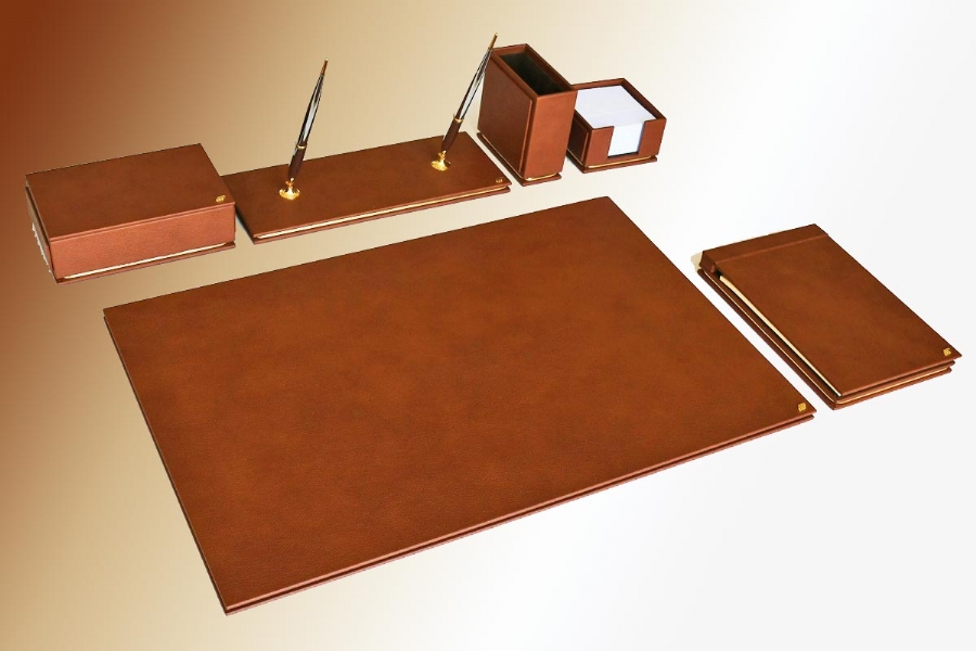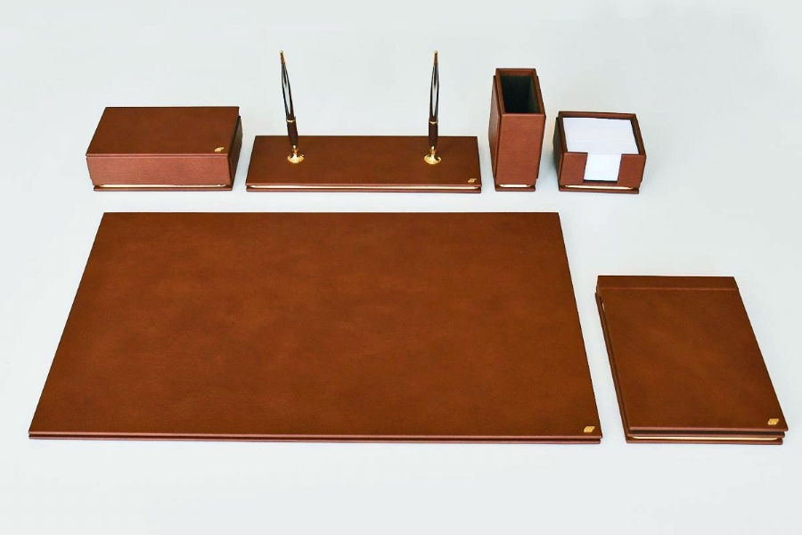 Özenle seçilmiş İtalyan deri ile hazırlanan bu sümen takımı; kusursuz el işçiliği bütünleşmiş ve kullanılan aksesuarlarla zenginleştirilmiştir. Seçkin ofisler için hazırlanmış olan bu lüks masa setinin 40 değişik deri rengi ve özel seçebileceğiniz 20 parçası bulunmaktadır.