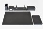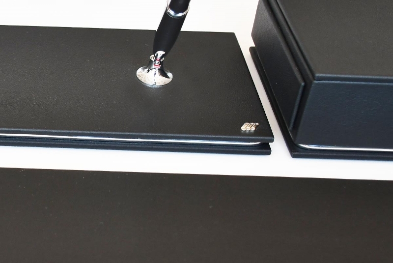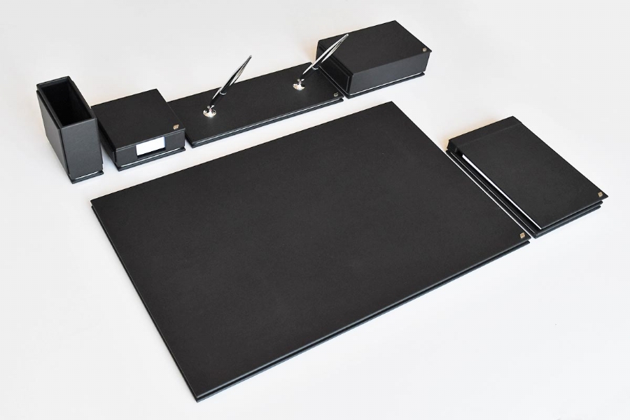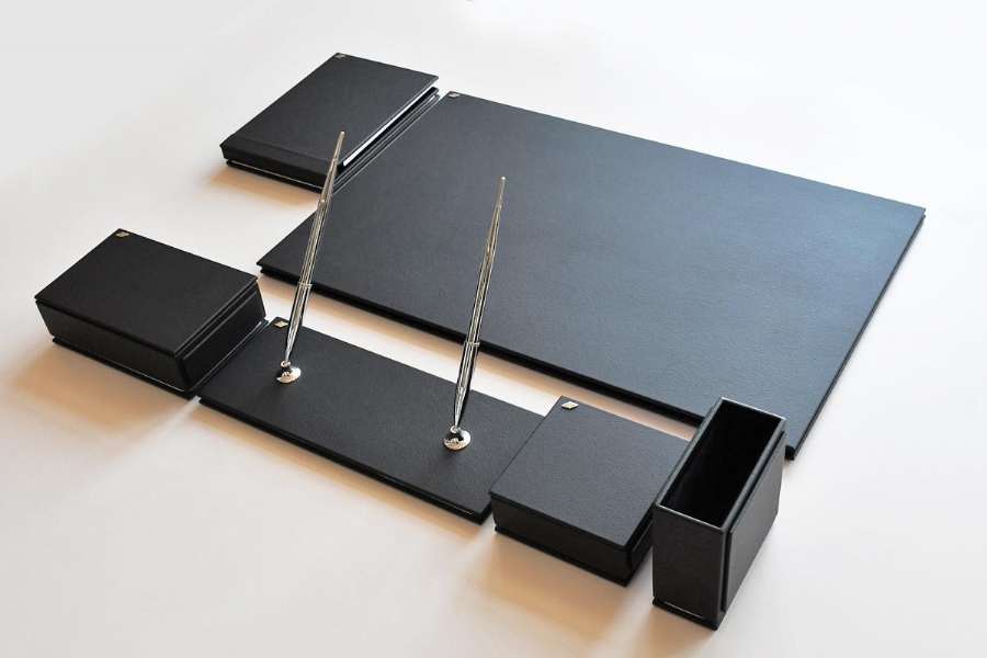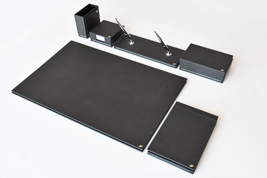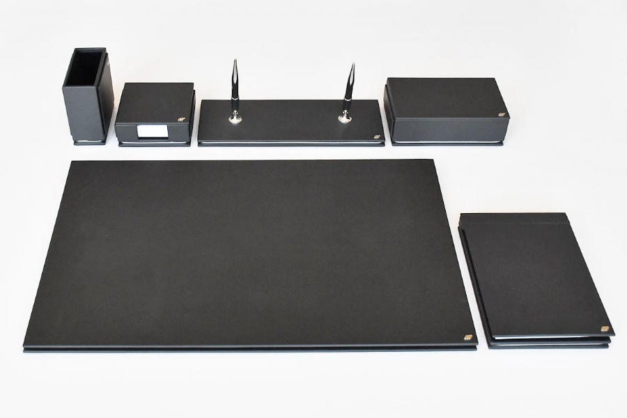 Özenle seçilmiş İtalyan deri ile hazırlanan bu sümen takımı; kusursuz el işçiliği bütünleşmiş ve kullanılan aksesuarlarla zenginleştirilmiştir. Seçkin ofisler için hazırlanmış olan bu lüks masa setinin 40 değişik deri rengi ve özel seçebileceğiniz 20 parçası bulunmaktadır.