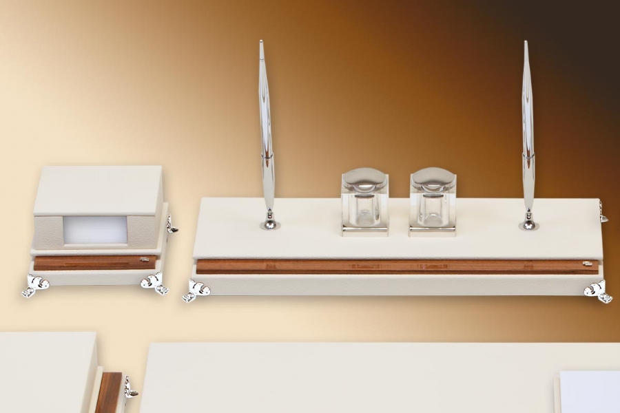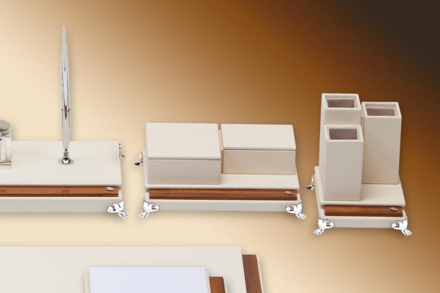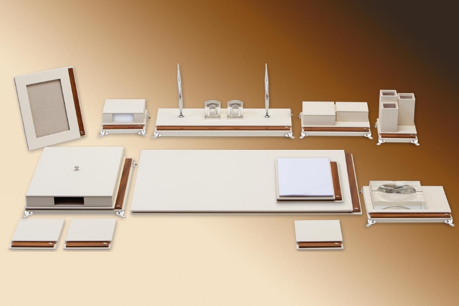 Klasik İtalyan deri, ağaç ve altın kaplamanın en güzel örneklerinden biri olan bu takım; tamamen el yapımı olarak özel derisi ile zerafeti yansıtmaktadır. Klasik ofislerin vazgeçilmez aksesuarı olan bu setin kırk değişik renk seçeneği bulunmaktadır.