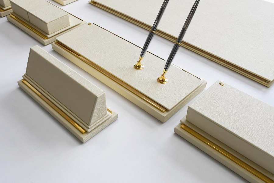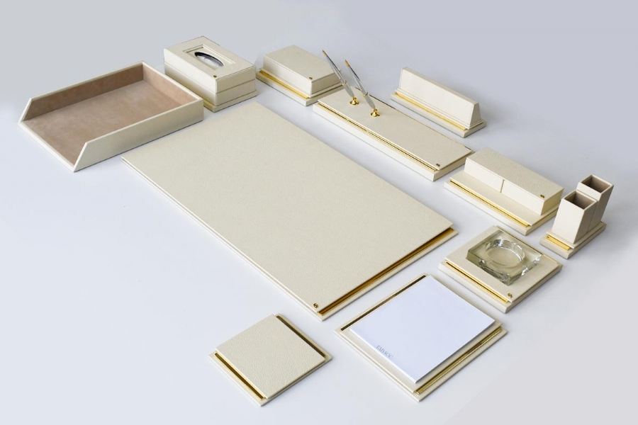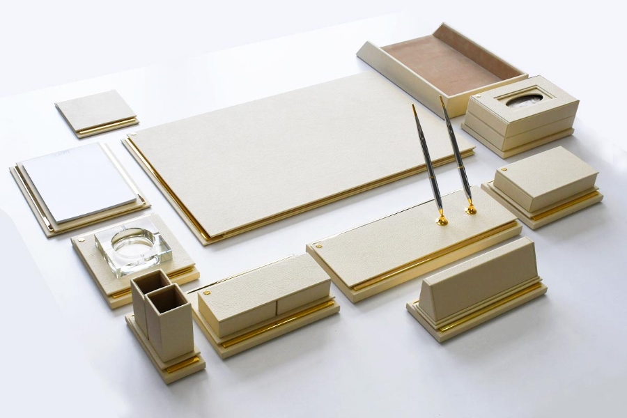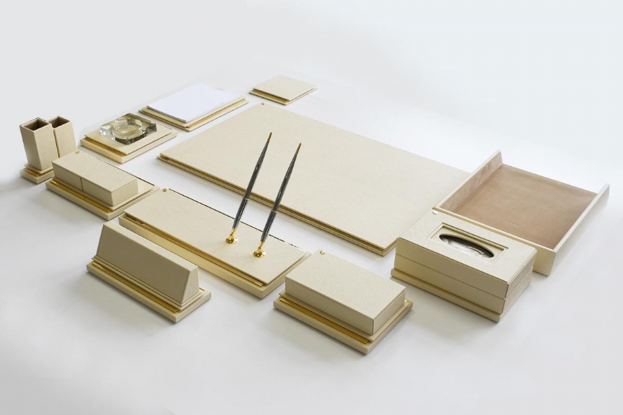 Klasik İtalyan deri ve altın kaplamanın en güzel örneklerinden biri olan bu sümen takımı; kusursuz el işçiliği ve özel derisi ile zerafeti yansıtmaktadır. Klasik ofislerin vazgeçilmez aksesuarları olan bu lüks masa setlerinin kırk değişik renk seçeneği bulunmaktadır.