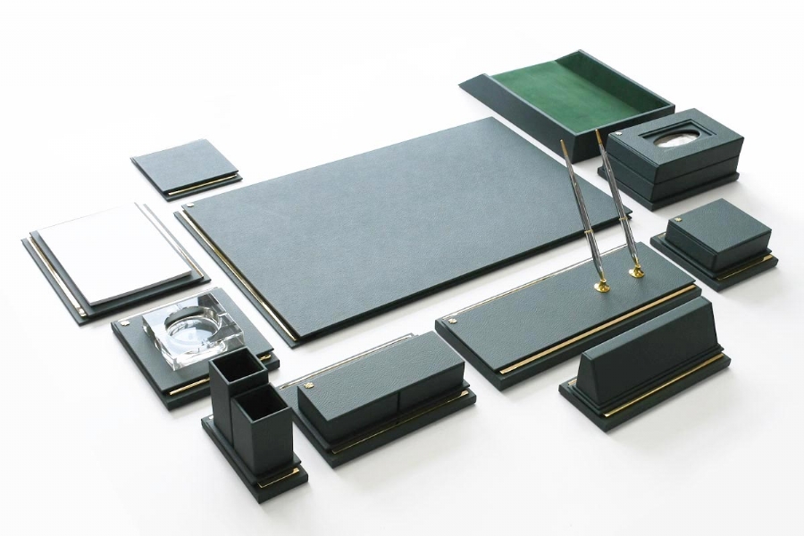 Klasik İtalyan deri ve altın kaplamanın en güzel örneklerinden biri olan bu sümen takımı; kusursuz el işçiliği ve özel derisi ile zerafeti yansıtmaktadır. Klasik ofislerin vazgeçilmez aksesuarları olan bu lüks masa setlerinin kırk değişik renk seçeneği bulunmaktadır.