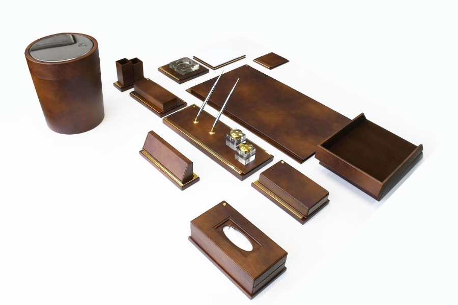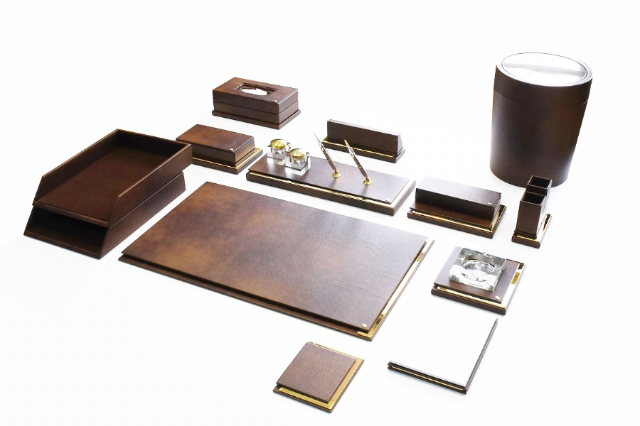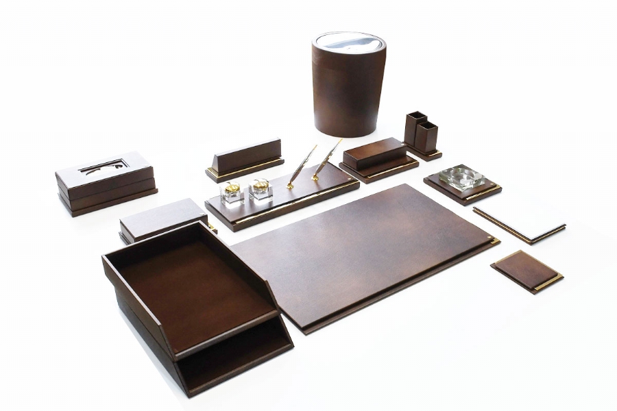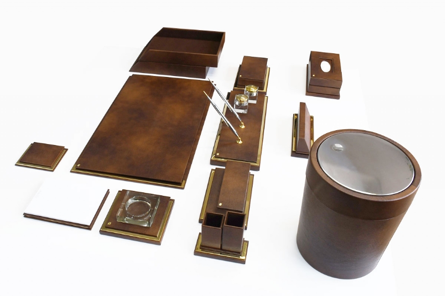 Klasik İtalyan deri ve altın kaplamanın en güzel örneklerinden biri olan bu sümen takımı; kusursuz el işçiliği ve özel derisi ile zerafeti yansıtmaktadır. Klasik ofislerin vazgeçilmez aksesuarları olan bu lüks masa setlerinin kırk değişik renk seçeneği bulunmaktadır.