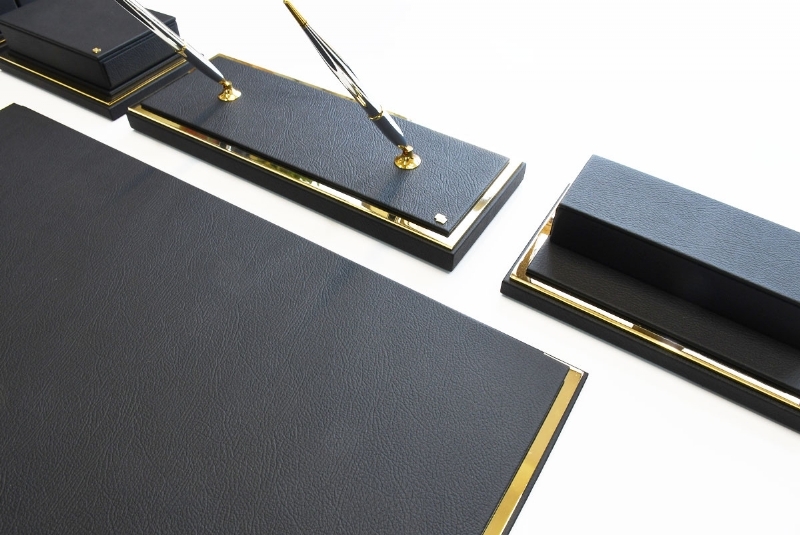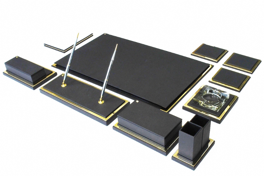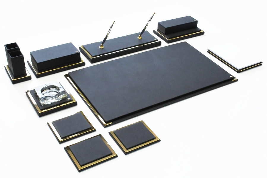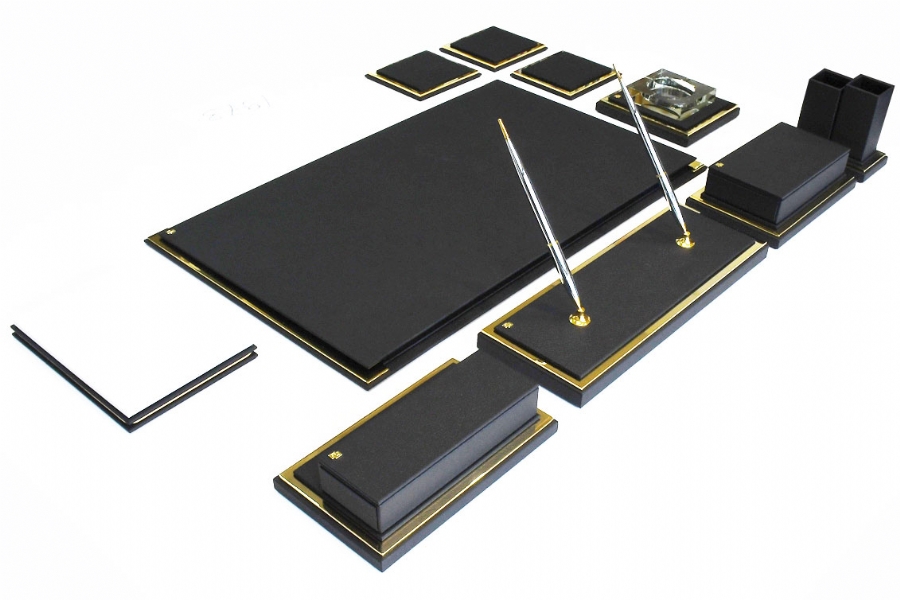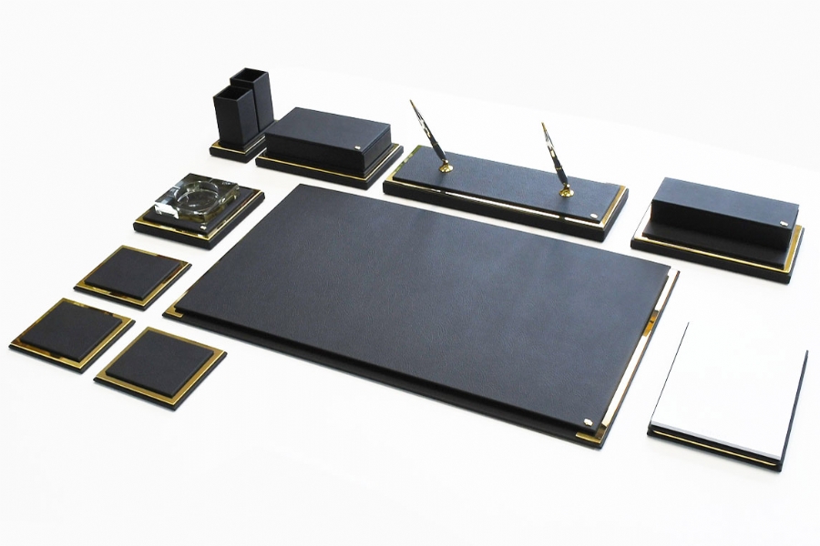 Klasik İtalyan deri ve altın kaplamanın en güzel örneklerinden biri olan bu sümen takımı; kusursuz el işçiliği ve özel derisi ile zerafeti yansıtmaktadır. Klasik ofislerin vazgeçilmez aksesuarları olan bu lüks masa setlerinin kırk değişik renk seçeneği bulunmaktadır.