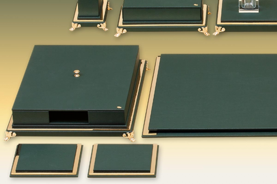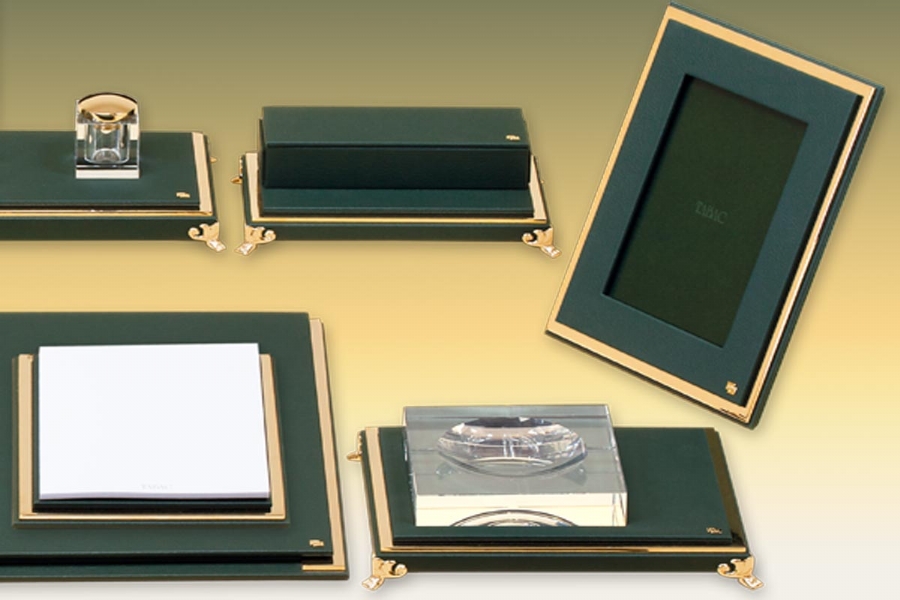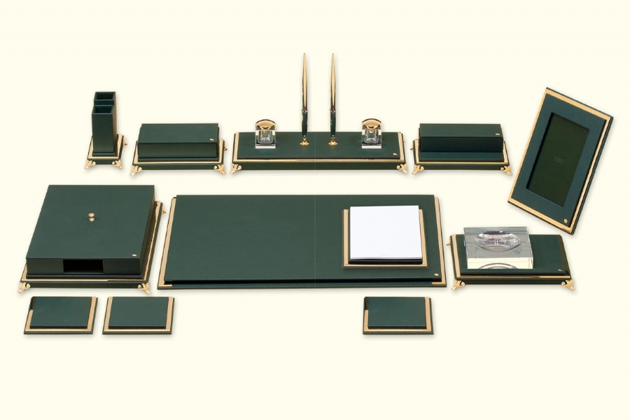 Klasik İtalyan deri ve altın kaplamanın en güzel örneklerinden biri olan bu takım; tamamen el yapımı olarak özel derisi ile zerafeti yansıtmaktadır. Klasik ofislerin vazgeçilmez aksesuarı olan bu setin kırk değişik renk seçeneği bulunmaktadır.