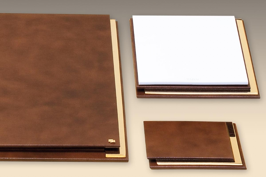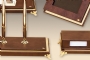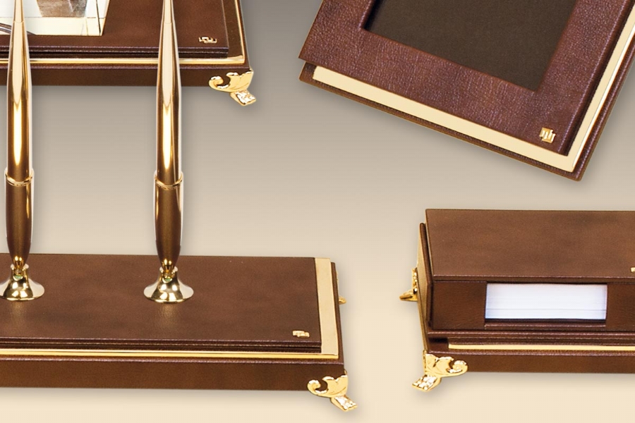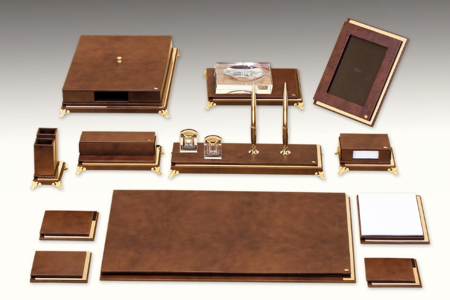 Klasik İtalyan deri ve altın kaplamanın en güzel örneklerinden biri olan bu sümen takımı; kusursuz el işçiliği ve özel derisi ile zerafeti yansıtmaktadır. Klasik ofislerin vazgeçilmez aksesuarları olan bu lüks masa setlerinin kırk değişik renk seçeneği bulunmaktadır.