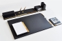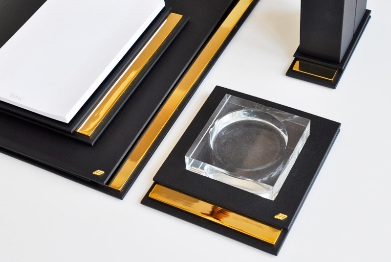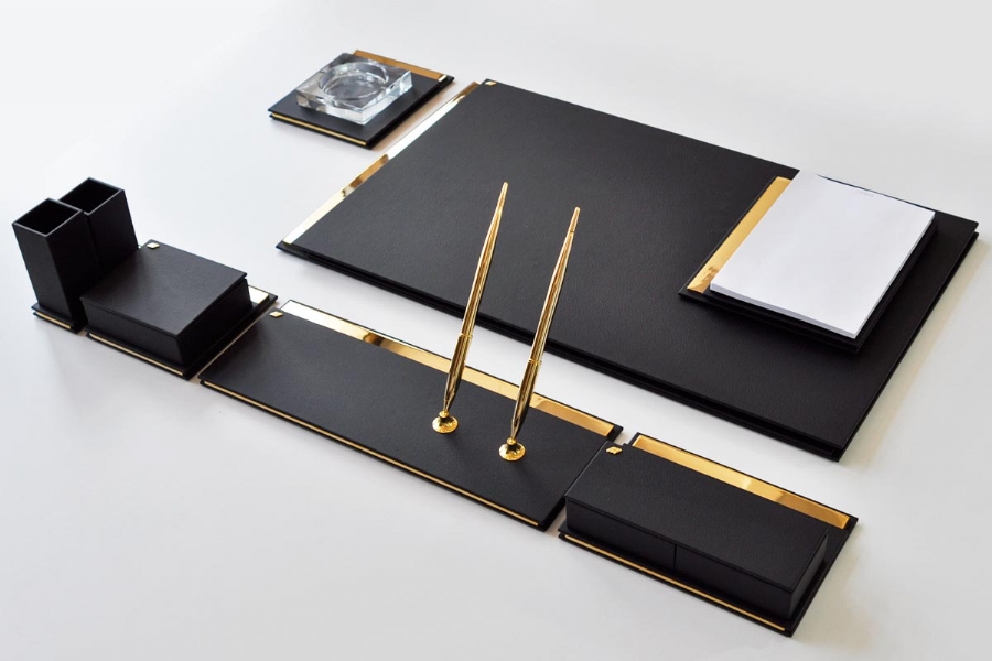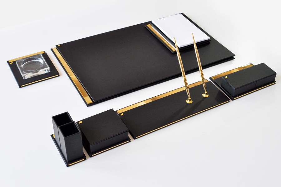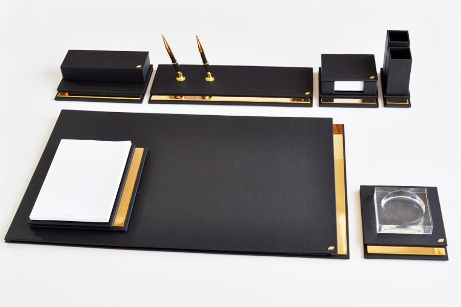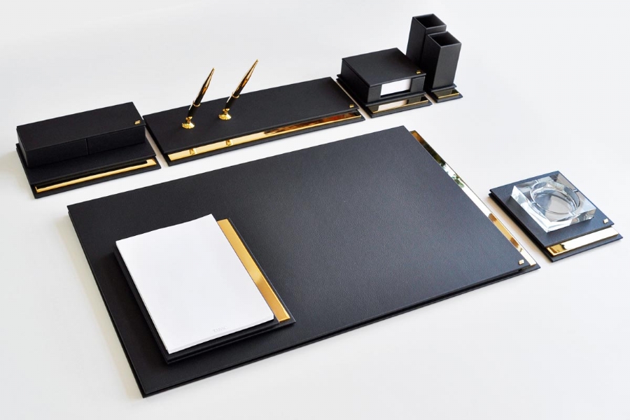 Klasik İtalyan deri ve altın kaplamanın en güzel örneklerinden biri olan bu sümen takımı; kusursuz el işçiliği ve özel derisi ile zerafeti yansıtmaktadır. Klasik ofislerin vazgeçilmez aksesuarları olan bu lüks masa setlerinin kırk değişik renk seçeneği bulunmaktadır.