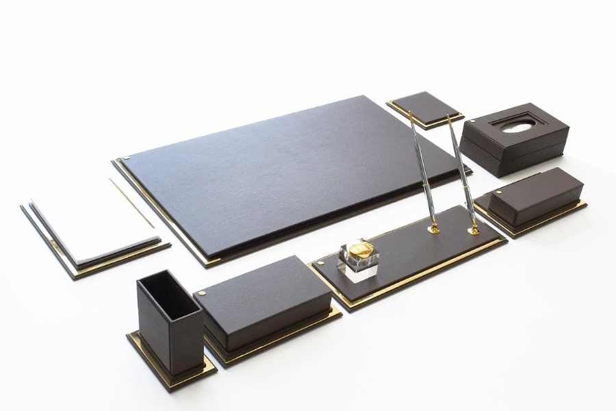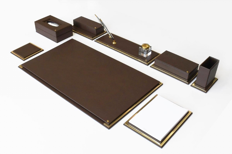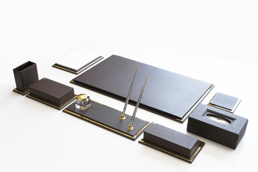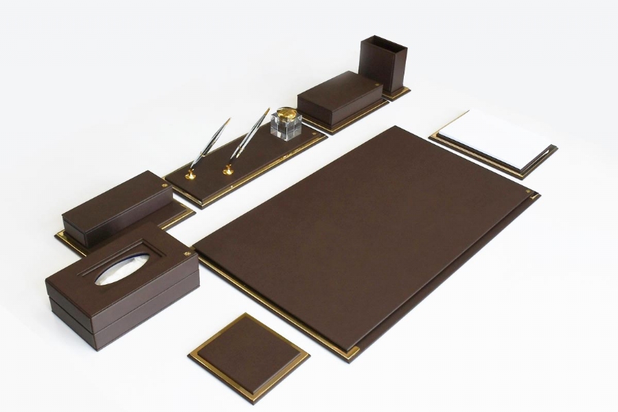 Klasik İtalyan deri ve altın kaplamanın en güzel örneklerinden biri olan bu sümen takımı; kusursuz el işçiliği ve özel derisi ile zerafeti yansıtmaktadır. Klasik ofislerin vazgeçilmez aksesuarları olan bu lüks masa setlerinin kırk değişik renk seçeneği bulunmaktadır.